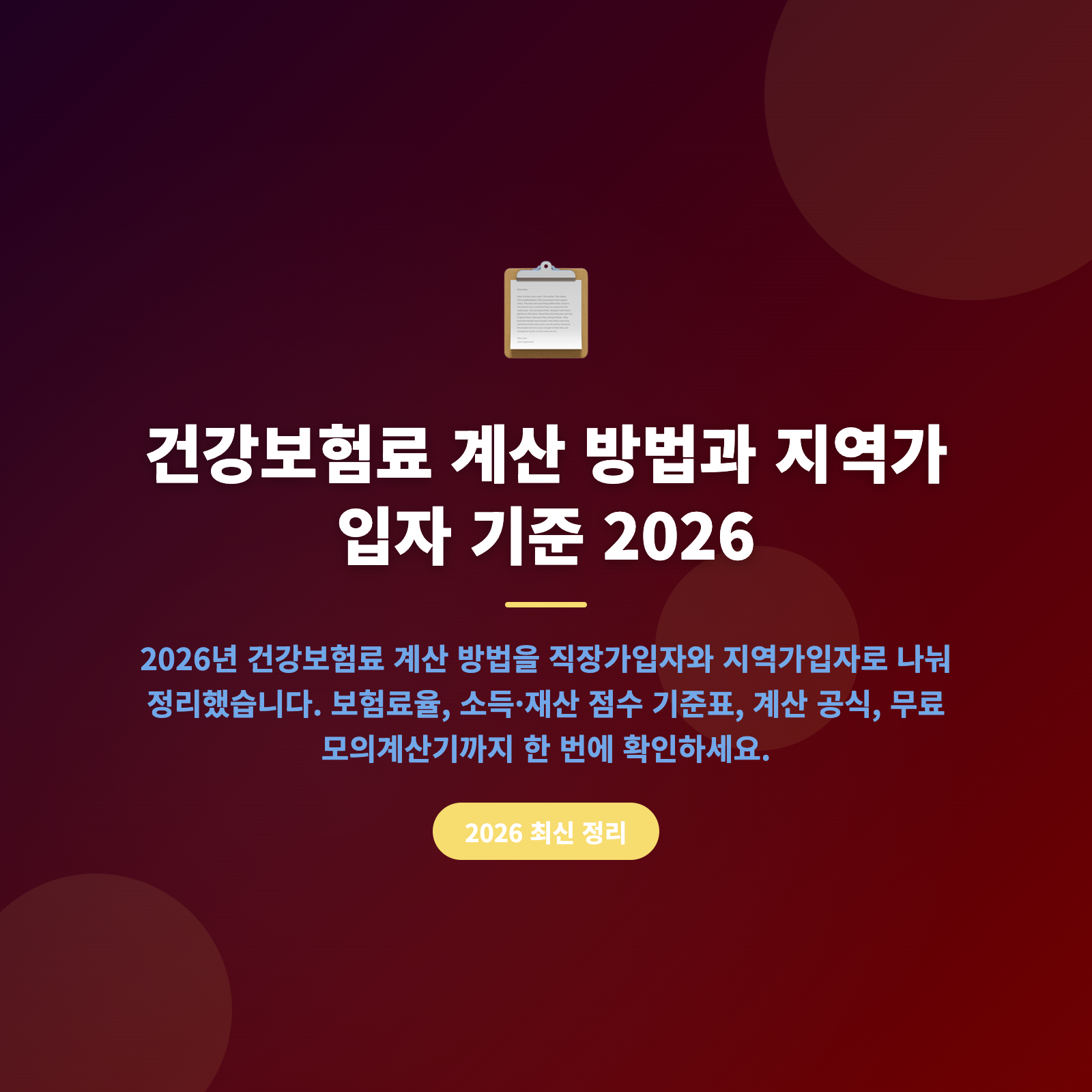 직장에서 매달 빠져나가는 건강보험료와, 프리랜서·자영업자가 내는 건강보험료가 완전히 다른 방식으로 계산된다는 거 알고 계셨나요? 같은 소득이라도 직장가입자냐 지역가입자냐에 따라 보험료가 수십만 원까지 차이 날 수 있어요. 이 글에서는 2026년 기준 건강보험료 계산 공식, 직장·지역가입자별 기준표, 그리고 내 보험료를 바로 확인할 수 있는 무료 계산기까지 한 번에 정리해드릴게요.