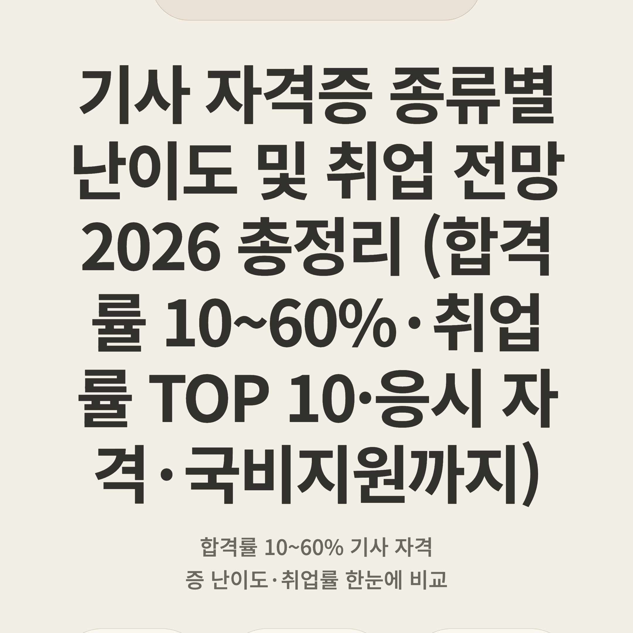 > ⚡ 3초 요약 > 2026년 기준 국가기술자격 기사 자격증은 약 130여 종목이며, 합격률은 종목별 10~60%로 큰 차이. 비전공자도 학점은행제 106학점 이수 시 응시 가능. 전기기사·정보처리기사·건축기사가 취업률 TOP 3이며, 공기업·공무원 가산점 3~5% 혜택.