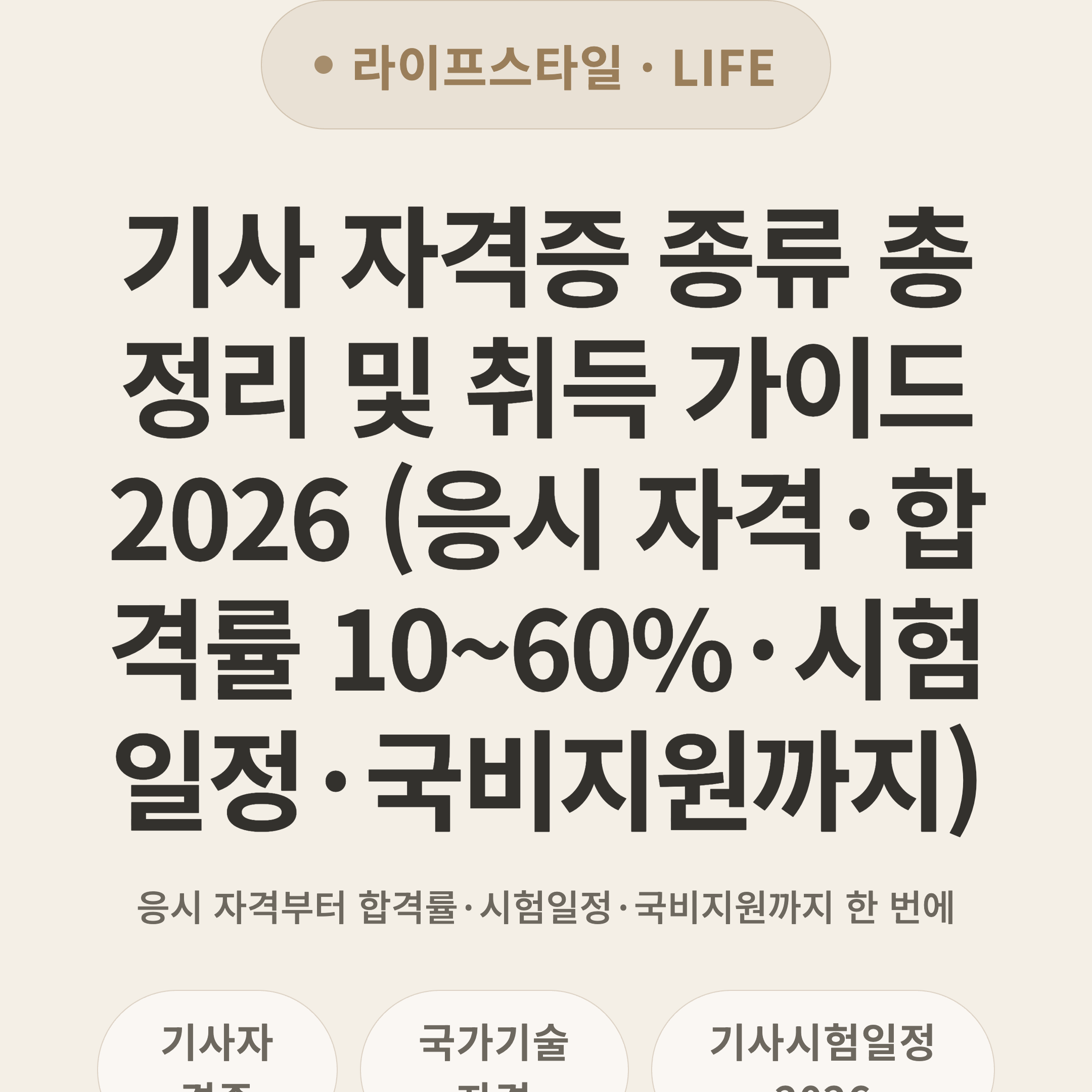 > ⚡ 3초 요약 > 기사 자격증은 국가기술자격 중 기술사 다음 등급으로, 2026년 기준 약 130여 종목이 운영되고 있어요. 응시 자격은 관련 학과 졸업(예정)자 또는 산업기사+실무 1년 이상이며, 필기 과목당 40점·평균 60점 이상, 실기 60점 이상이면 합격. 시험은 연 3회(Q-net 접수), 종목별 합격률은 10~60%로 편차가 커요.