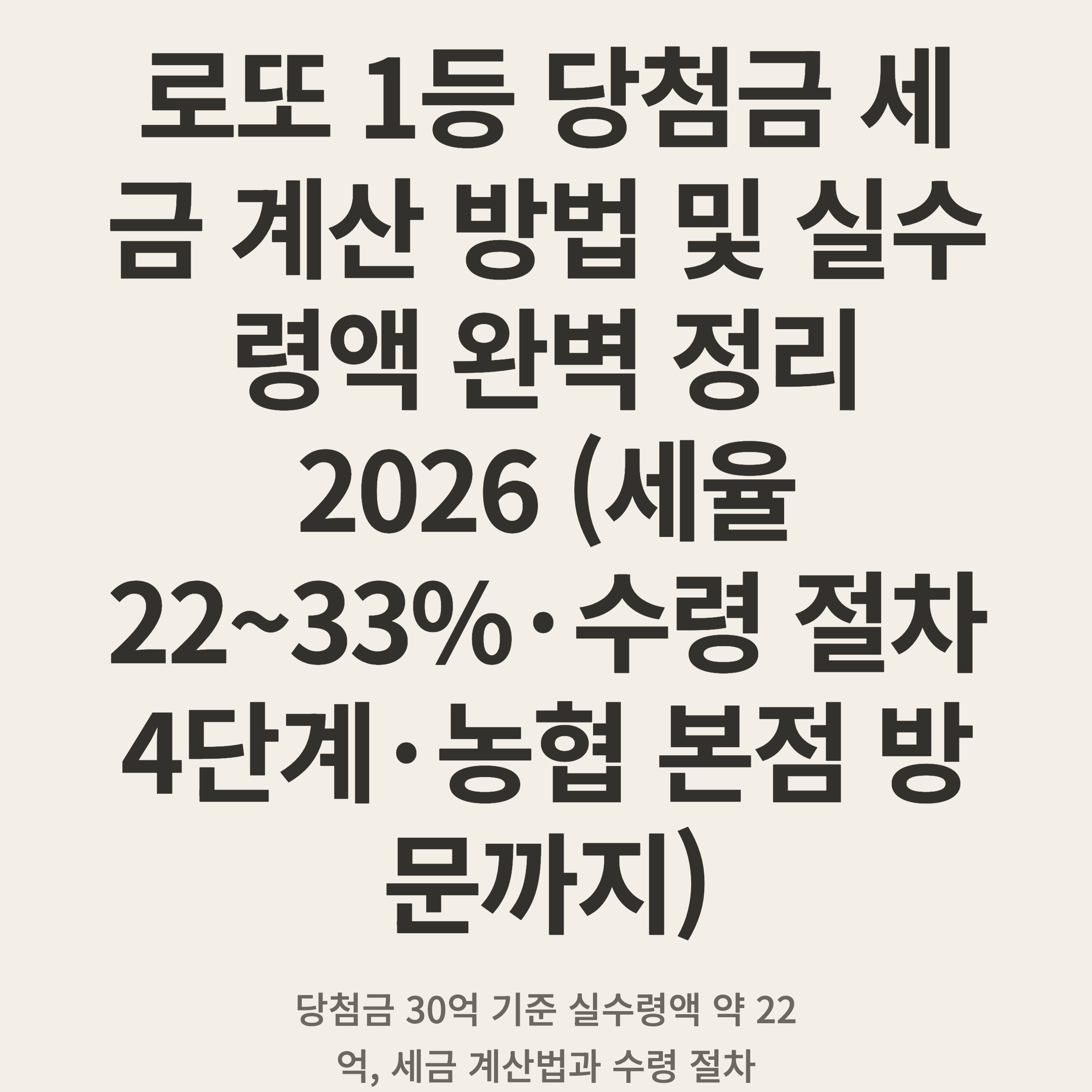 > ⚡ 3초 요약 > 로또 당첨금 200만 원 이하 비과세, 3억 원 이하 22%(소득세 20%+지방소득세 2%), 3억 원 초과분 33%(소득세 30%+지방소득세 3%) 원천징수. 1등은 농협은행 본점에서만 수령 가능하며, 당첨 복권·신분증·통장 지참 필수. (2026년 기준, 소득세법 제129조)