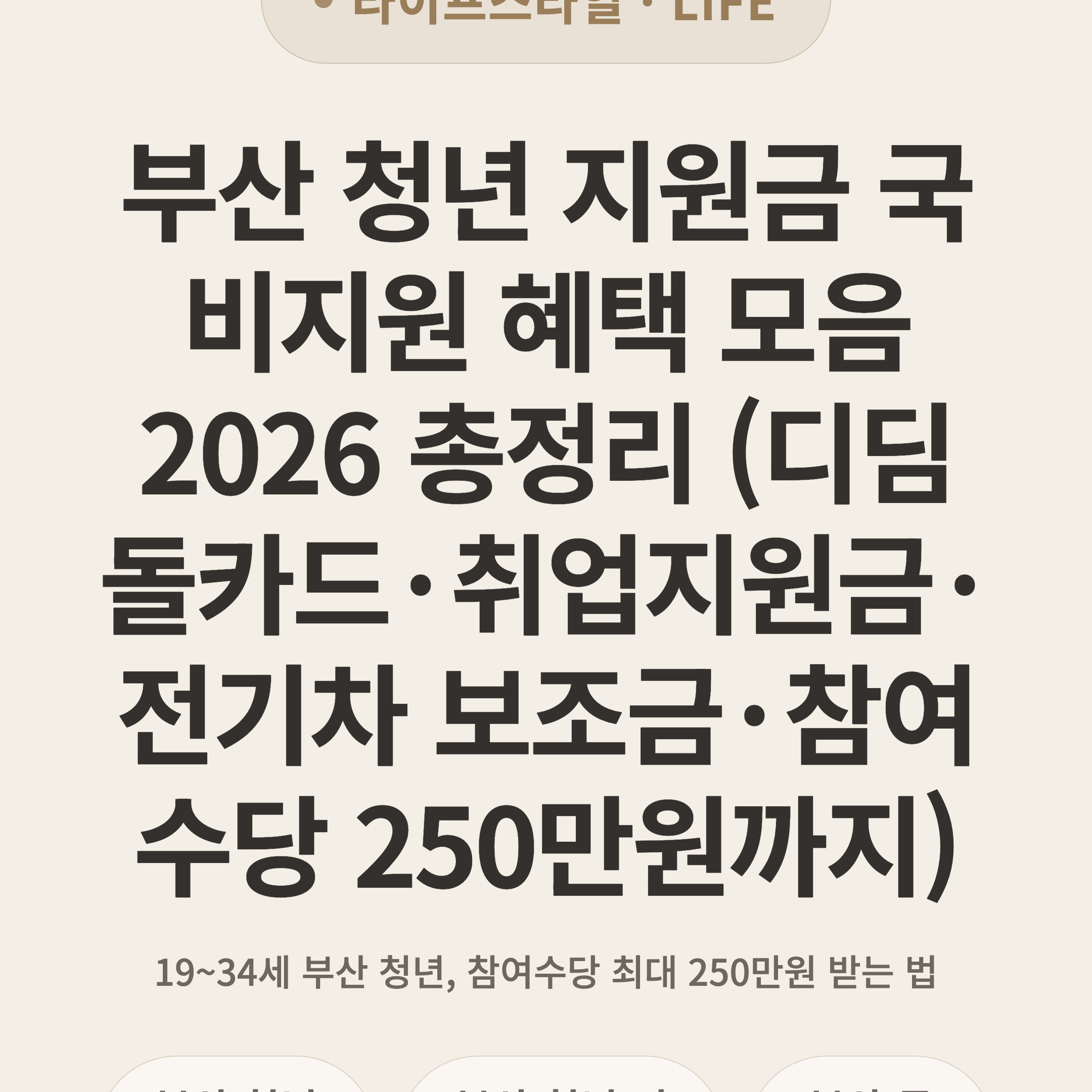 > ⚡ 3초 요약 > 2026년 부산 거주 만 19~34세 청년 대상. 취업역량 강화 참여수당 50~250만원 + 인센티브 20~50만원, 부산 청년 디딤돌카드 PLUS 교통·문화 지원, 부산청년EV드림 전기차 구입 보조금까지. 신청은 부산청년플랫폼에서 통합 확인 가능.