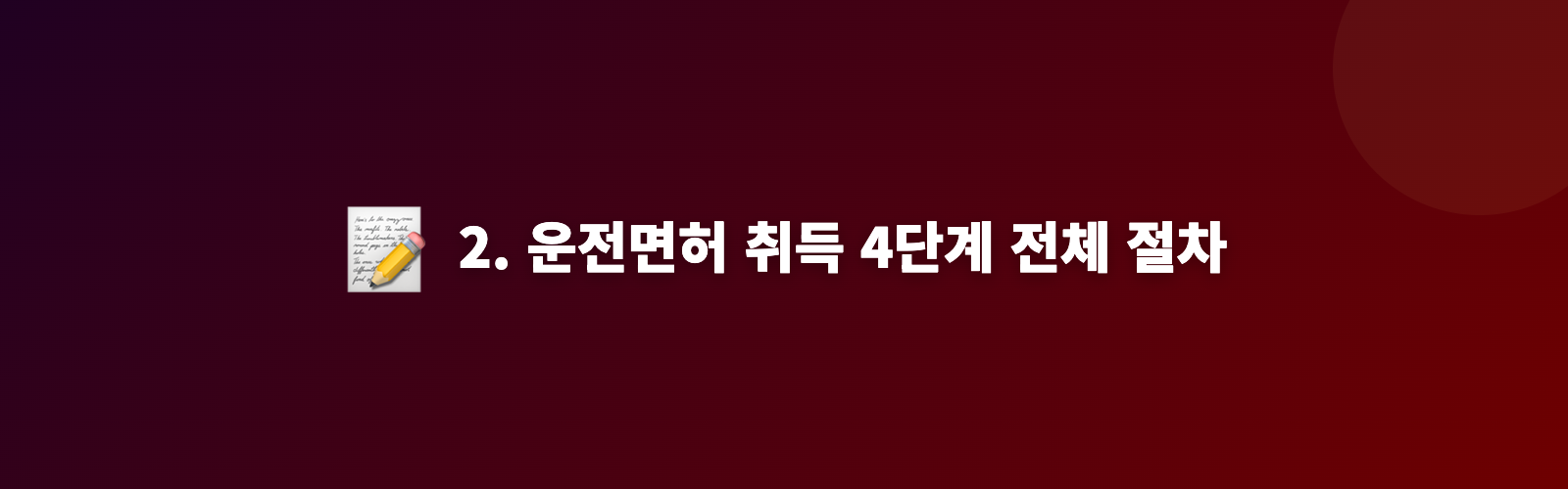 1단계: 교통안전교육 + 신체검사(적성검사) → 2단계: 학과시험 → 3단계: 기능시험 → 4단계: 도로주행시험 → 면허증 발급 🎉
