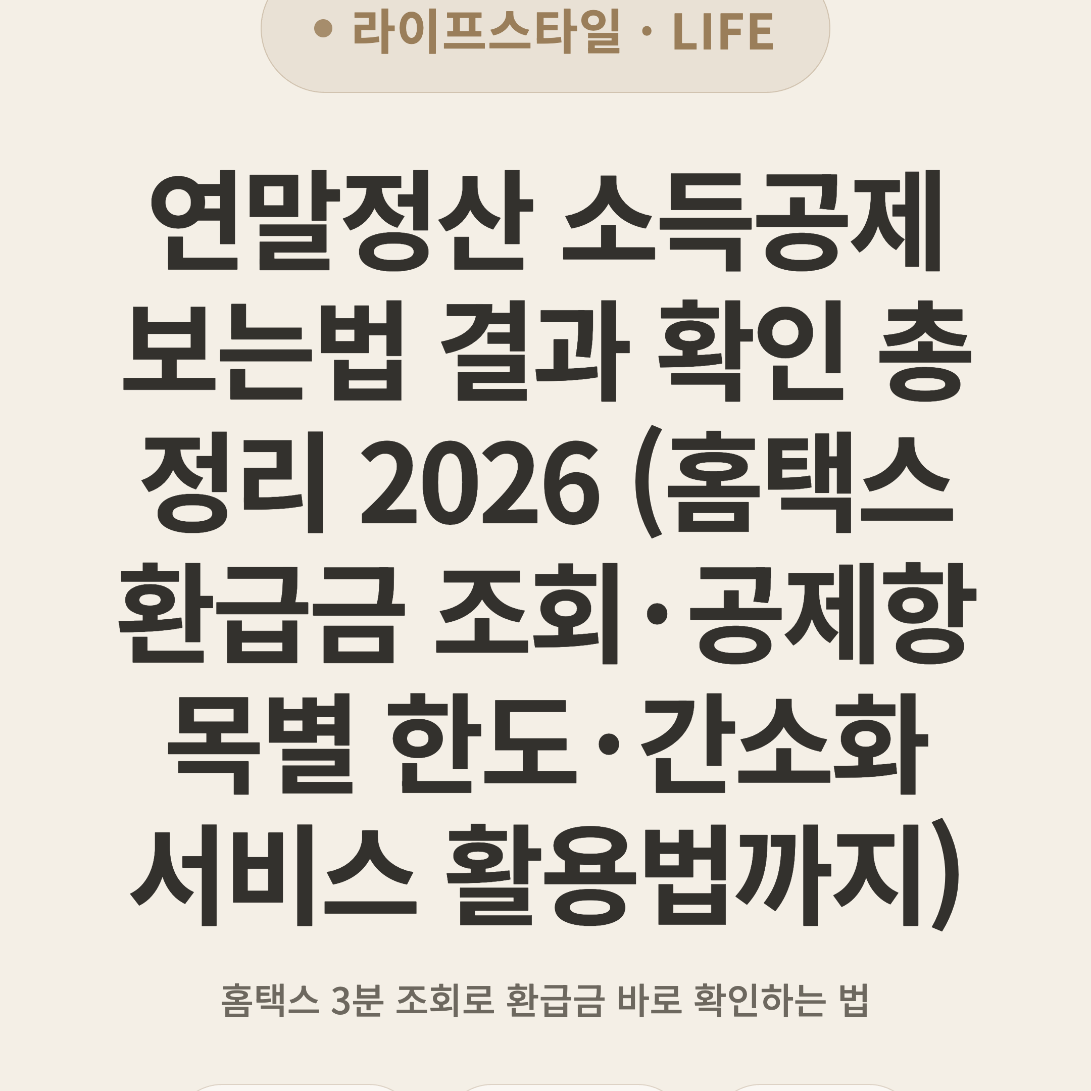 > ⚡ 3초 요약 > 2026년 연말정산 결과는 홈택스(hometax.go.kr) → My홈택스 → 연말정산 지급명세서에서 확인 가능. 간소화 서비스는 매년 1월 15일 오픈되며, 2월 말~3월 초 급여에 환급금(또는 추가 납부액)이 반영돼요. 신용카드·의료비·교육비·주택청약 등 공제항목별 한도를 미리 파악하면 "13월의 월급"을 극대화할 수 있어요.