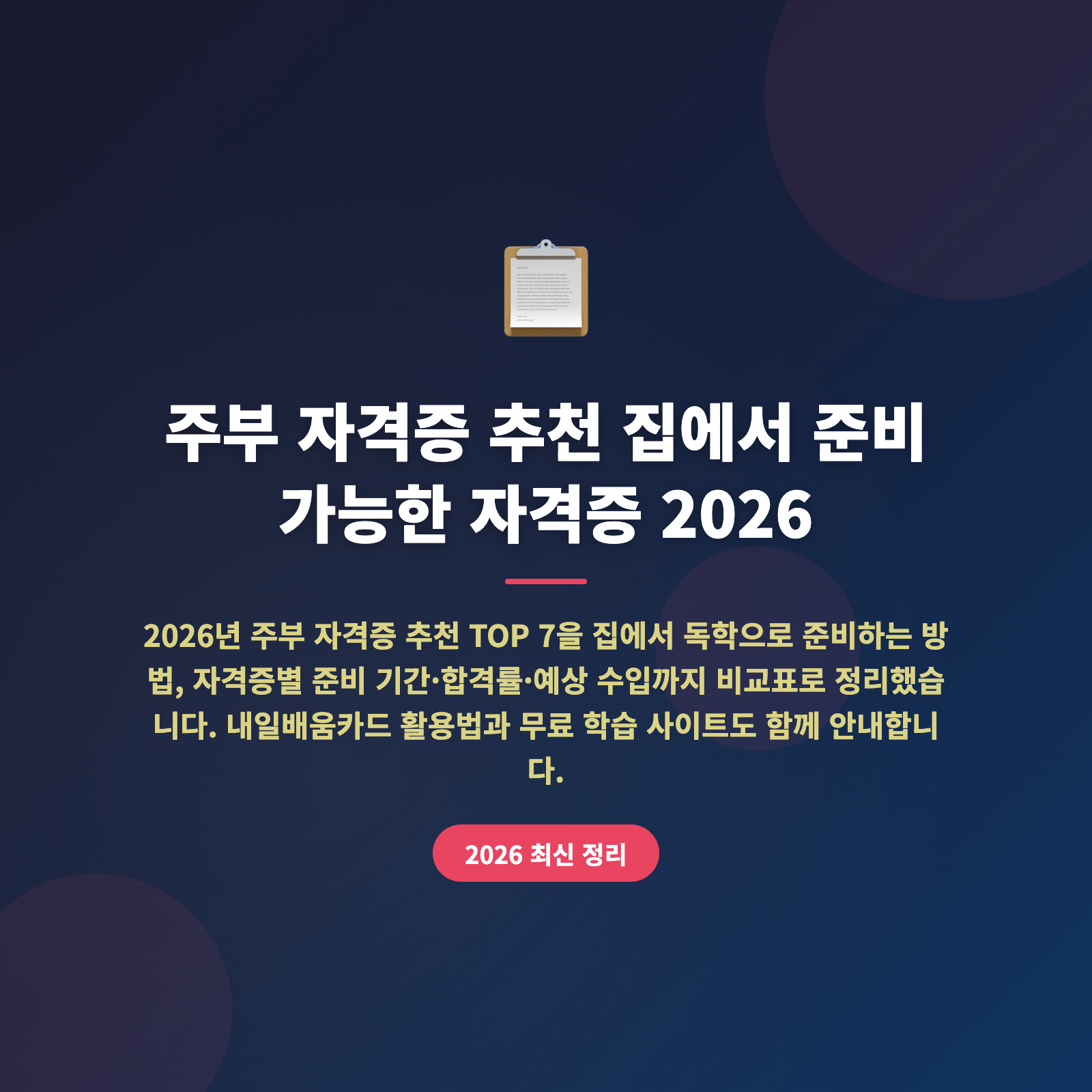 - 주부 재취업 자격증 추천 현실적 비교 2026 (취업률 높은 TOP 7·내일배움카드 500만원·준비 기간·난이도 한눈에 정리)