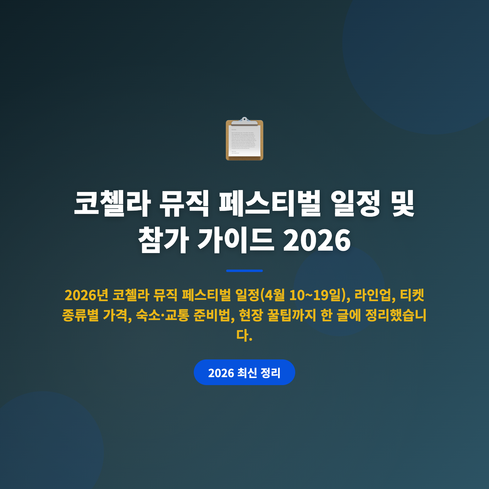 ✅ 2026 코첼라 일정: Weekend 1 (4/10~12), Weekend 2 (4/17~19) — 캘리포니아 인디오 개최 ✅ 올해 라인업 핵심: EDM 비중 45%, 헤드라이너 Anyma, K-pop 빅뱅·태민 출연 ✅ 티켓은 코첼라 공식 사이트에서만 구매 — GA 기준 약 $499~$599 ✅ 총 예산: 한국 출발 기준 약 329~728만 원 (절약형~여유형) ✅ 현장 필수템: 선크림, 빈 물병, 보조배터리, 밤용 겉옷