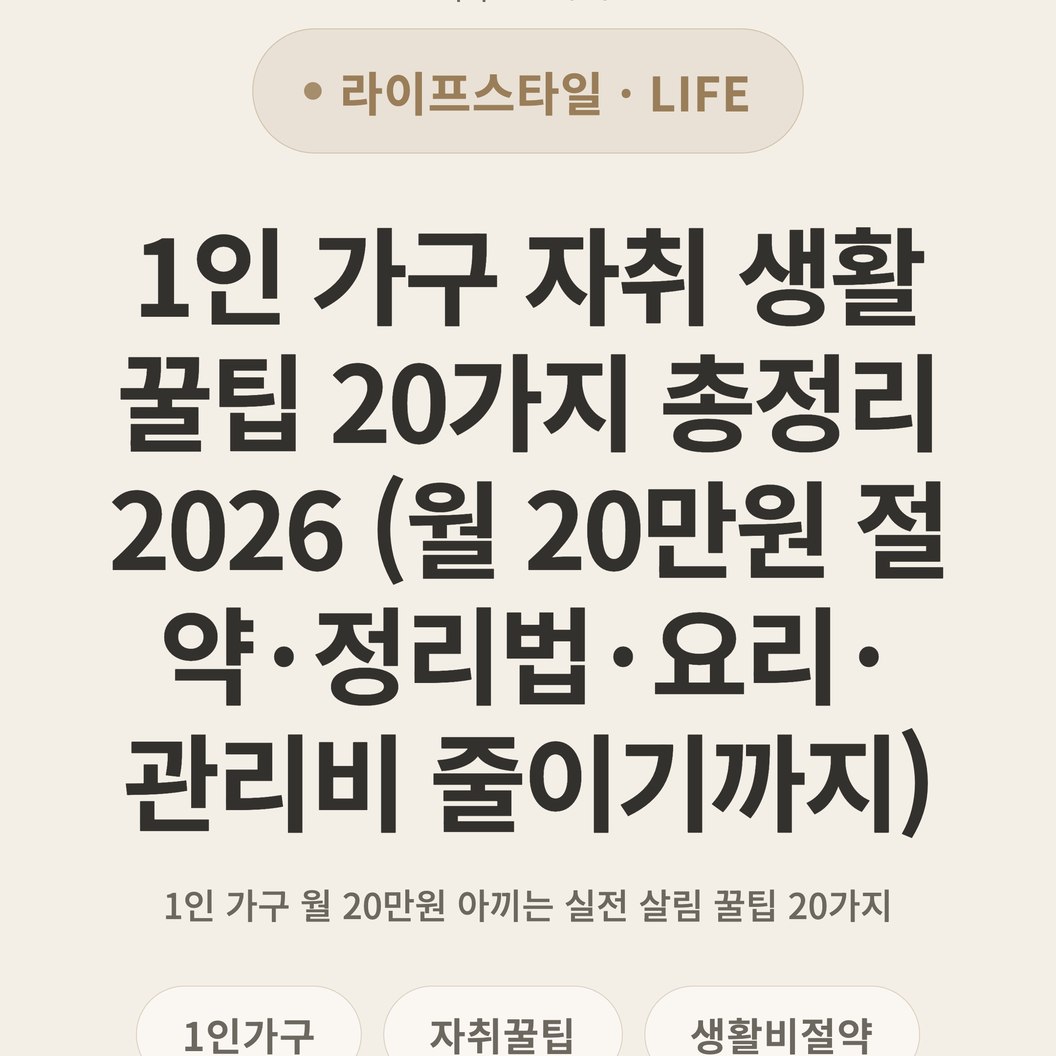 > ⚡ 3초 요약 > 2026년 1인 가구 약 1,000만 세대 시대, 월평균 생활비 약 150~180만원 중 식비·관리비·생활용품에서 월 20만원 이상 절약 가능. 냉장고 정리→장보기 루틴→전기세 관리→구독 정리 4단계 실천이 핵심.