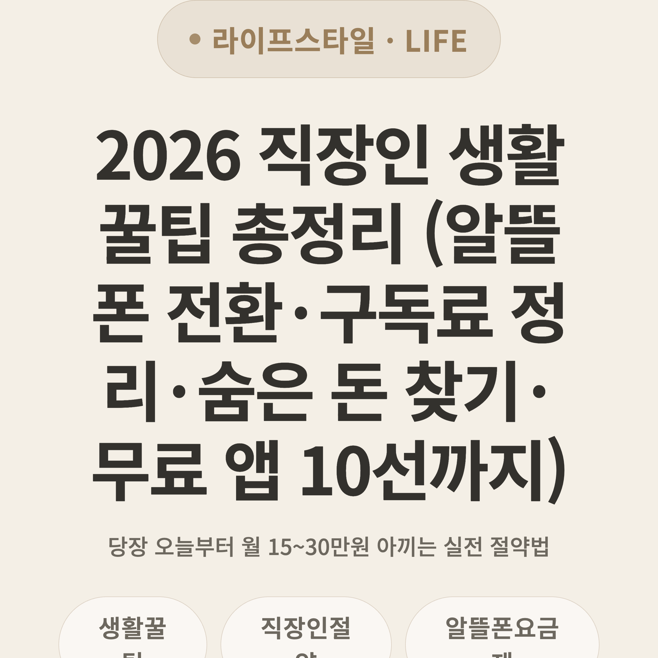 > ⚡ 3초 요약 > 알뜰폰 전환 시 월 2~4만원 절약, 구독 서비스 정리로 월 3~5만원 절감, 숨은 돈 찾기 서비스로 평균 15만원 환급. 통신비·구독료·미환급금·식비·교통비 5개 항목만 점검하면 월 15~30만원 절약 가능(2026년 기준).
