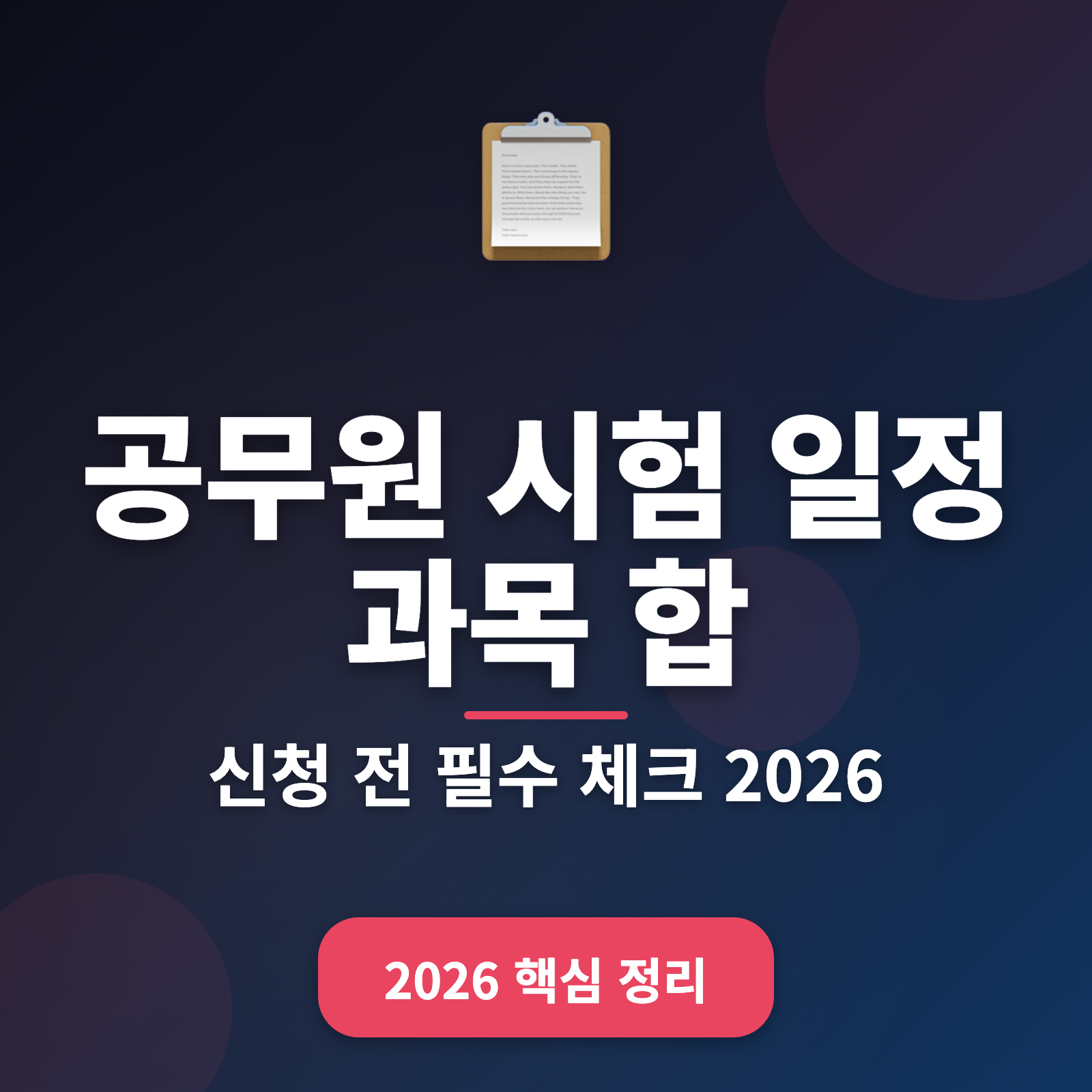 title: 공무원 시험 일정, 과목, 합격선까지 한눈에! 2026년 정보 총정리 description: 2026년 공무원 시험에 대한 모든 정보를 확인하세요. 일정, 과목, 합격선 등 필요한 정보가 전부 있습니다. 한 번에 끝내는 준비 가이드. tags: 공무원 시험, 2026년, 합격선, 시험 일정, MZ세대 category: tistory-infodrim ---