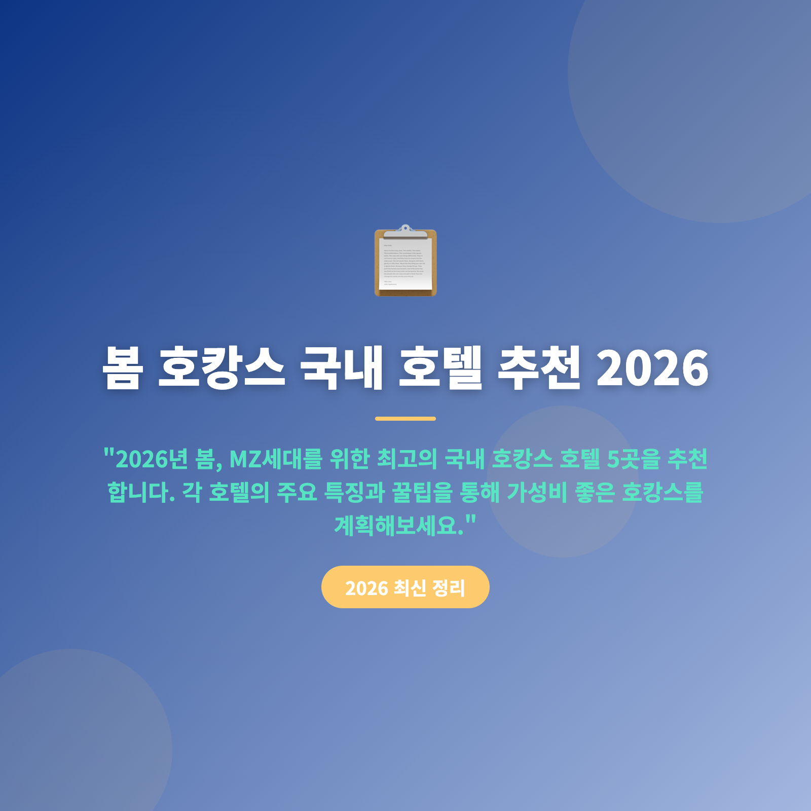 최근 통계에 따르면 2026년 MZ세대의 호캉스 선호도가 크게 증가했습니다. 이제 봄 시즌을 맞아 가성비 좋은 국내 호캉스 호텔 다섯 곳을 알아보겠습니다. 각 호텔의 특징, 예약 팁, 그리고 무료 도구까지 모두 포함하였습니다.