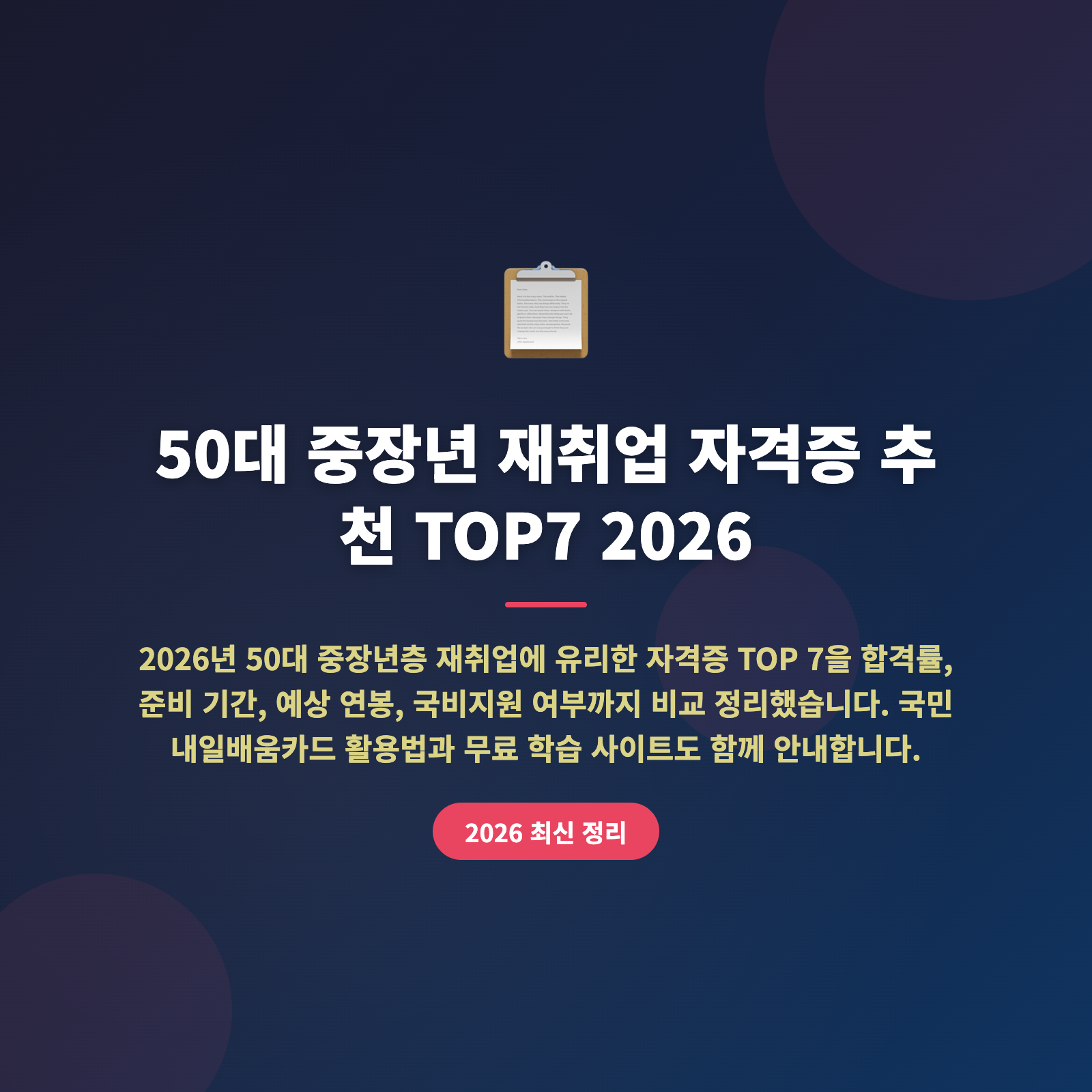 혹시 "50대에 새로 자격증을 따서 뭐가 달라지겠어?"라고 생각해보신 적 있으신가요? 결론부터 말씀드리면, 제대로 고른 자격증 하나가 50대 재취업 성공률을 2배 이상 끌어올릴 수 있어요. 이 글에서는 2026년 기준으로 50대 중장년층이 현실적으로 취득 가능하고, 실제 취업까지 연결되는 자격증 TOP 7을 합격률·준비 기간·예상 수입까지 꼼꼼하게 비교해드릴게요.