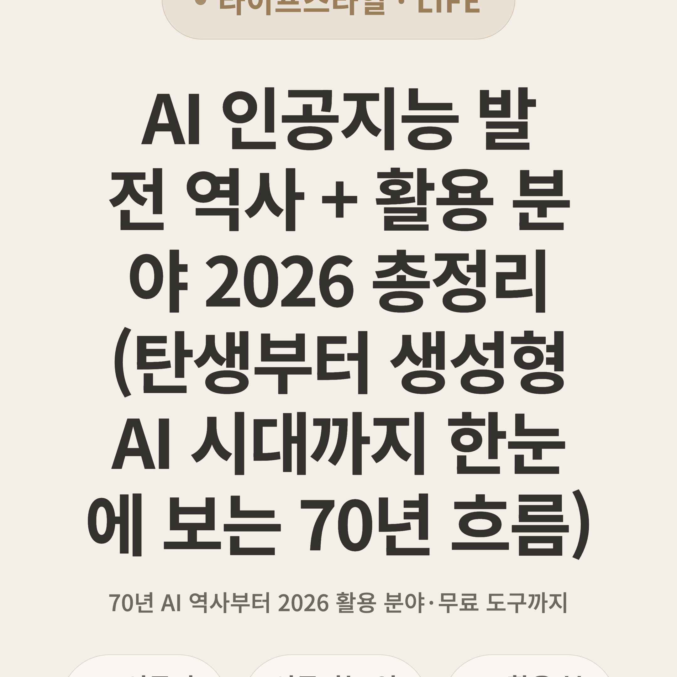 > ⚡ 3초 요약 > AI는 1956년 다트머스 회의에서 탄생해 70년간 발전, 2026년 현재 의료·금융·교육·창작 등 전 산업에 활용 중. ChatGPT·Claude·Gemini 등 생성형 AI가 일상화되었고, 글로벌 AI 시장 규모는 약 3,000억 달러 이상(2026년 추정). 직장인이라면 무료 AI 도구 활용법 필수.
