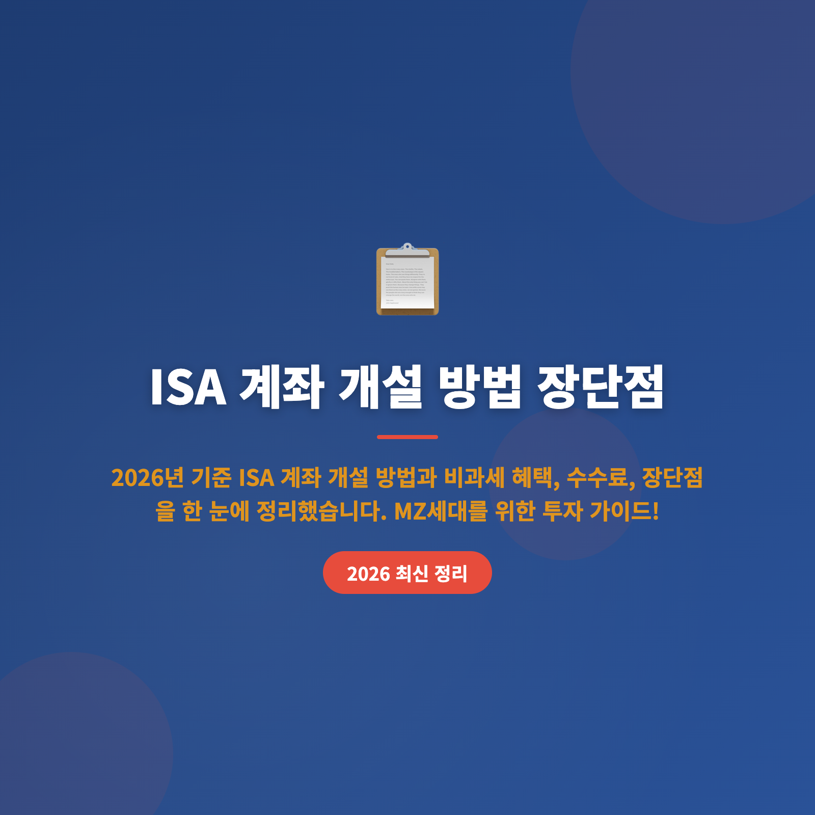 개인종합자산관리계좌(ISAs)는 요즘 젊은 직장인들 사이에서 큰 인기를 끌고 있는데요. ISA 계좌는 세금을 아끼면서 다양한 투자 옵션을 제공하는 장점이 있어요. 그런데 막상 개설하려니 어떻게 시작해야 할지 막막하신가요? 이 글에서는 2026년를 기준으로 ISA 계좌의 개설 방법과 장단점을 자세히 소개해 드릴게요.